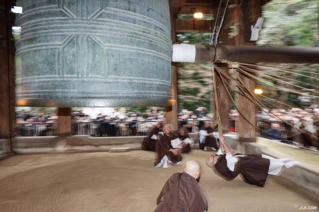El 27 de diciembre se celebró en el templo Chion-in (知恩院), en Kioto, el ensayo del Joya no Kane (除夜の鐘), el ritual budista con el que Japón despide el año. Durante la prueba, diecisiete monjes, siguiendo el ritmo de un canto ceremonial, coordinaron el esfuerzo colectivo necesario para hacer sonar la enorme campana del templo. El profundo y grave tañido resonó por la antigua capital como anticipo de la ceremonia de Nochevieja.